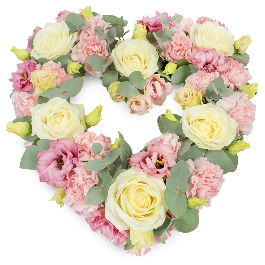 Express your love and remembrance with our stunning open heart tribute bouquet. This exquisite arrangement combines white roses, pink carnations, pink lisianthus, and lush eucalyptus leaves, all hand-selected to ensure exceptional freshness and quality.